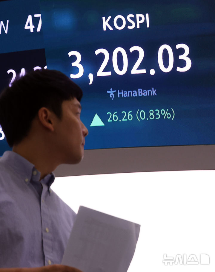 [서울=뉴시스] 최진석 기자 = 코스피가 전 거래일보다 0.83% 오른 3202.03 마감한 14일 서울 하나은행 본점 딜링룸 모니터에 종가가 표시돼 있다. 이날 기록한 3202.03은 종가 기준 연중 최고다. 2025.07.14. [email protected]