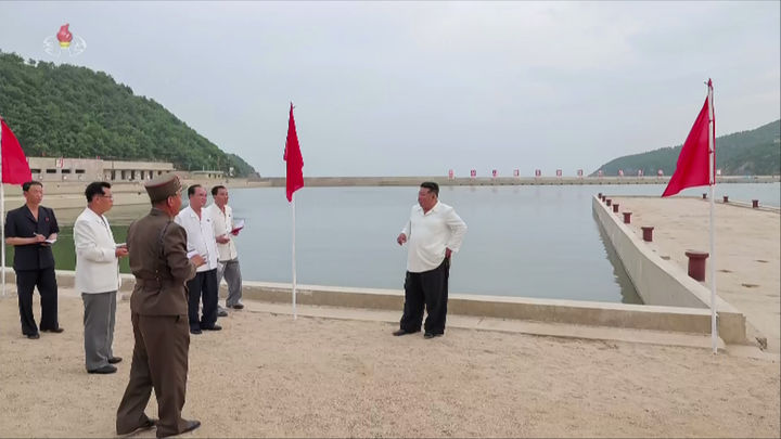 [서울=뉴시스] 김정은 북한 국무위원장이 지난 13일 락원군 바다가양식사업소 건설장을 현지지도했다고 조선중앙TV가 14일 보도했다. (사진=조선중앙TV 캡쳐) 2025.07.14. [email protected] *재판매 및 DB 금지