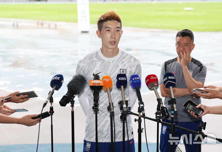 [성남=뉴시스] 황준선 기자 = 대한민국 남자 축구 국가대표팀 주장 조현우가 14일 경기 성남시 성남종합운동장에서 공개훈련에 앞서 인터뷰를 하고 있다.