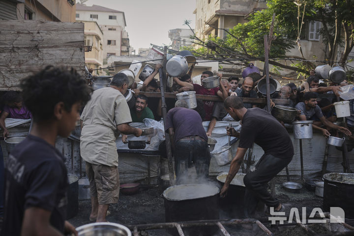 [가자시티=AP/뉴시스] 14일(현지 시간) 가자지구 가자시티 내 한 공동 급식소에서 팔레스타인 주민들이 음식을 받기 위해 몰려들고 있다. 2025.07.15.