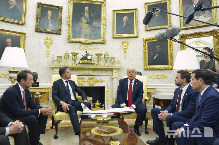 [워싱턴=AP/뉴시스] 도널드 트럼프(오른쪽) 미국 대통령이 14일(현지시각) 백악관 집무실에서 마르크 뤼테 북대서양조약기구(NATO) 사무총장과 회담하고 있다. 트럼프 대통령은 "러-우 전쟁은 트럼프의 전쟁이 아니라 바이든, 민주당의 전쟁"이라며 우크라이나 평화 협정 이외에는 미국이 직접적 책임을 질 생각이 없음을 분명히 했다. 2025.7.15.