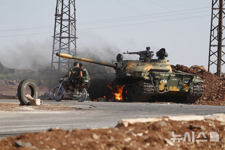 [스웨이다=AP/뉴시스] 14일(현지 시간) 시리아 남부 스웨이다 외곽에서 드루즈족 민병대와 수니파 베두인 부족 간 무력 충돌이 벌어진 가운데, 시리아 정부군 병사들이 오토바이를 타고 불타는 전차 옆을 지나가고 있다. 시리아인권관측소(SOHR)는 전날부터 발생한 이 충돌로 베두인 부족 10명, 드루즈 부족 27명이 사망했다고 밝혔다. 2025.07.15.
