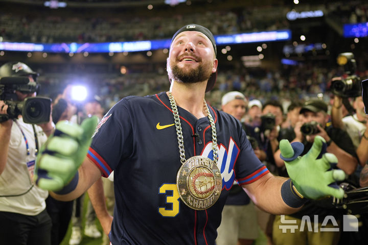 [애틀랜타=AP/뉴시스] 시애틀 매리너스 포수 칼 롤리가 14일(현지 시간) 미 조지아주 애틀랜타의 트루이스트 파크에서 열린 2025 메이저리그(MLB) 올스타전 홈런 더비에서 우승한 후 기뻐하고 있다. 롤리는 결승에서 18개의 홈런을 쳐 탬파베이 레이스의 후니오르 카미네로를 3개 차로 앞서며 MLB 사상 처음으로 포수로서 우승을 차지했다. 이날 롤리의 부친 토드 롤리가 공을 던지고, 동생 토드 주니어가 포수 마스크를 쓰기도 했다. 2025.07.15.