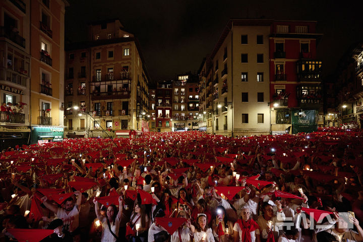 [팜플로나=AP/뉴시스] 15일(현지 시간) 스페인 북부 팜플로나에서 산 페르민 축제 마지막 날을 맞아, 참가자들이 촛불과 붉은 손수건을 들고 폐막노래 '포브레 데 미'(Pobre de Mí)를 부르며 9일간 이어진 축제를 마무리하고 있다. 2025.07.15.