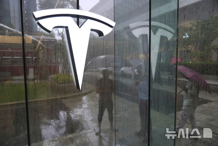 [뭄바이=AP/뉴시스] 15일(현지 시간) 인도 뭄바이 중심가에 비가 내리는 가운데, 이날 문을 여는 인도 최초의 테슬라 전시장 앞에서 사설 경비원들이 경비를 서고 있다. 2025.07.15.