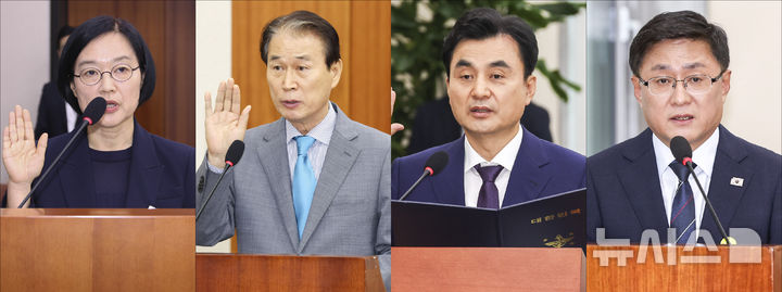 [서울=뉴시스] 김금보 고승민 조성봉 김명년 기자 = 한성숙 중소벤처기업부 장관 후보자, 권오을 국가보훈부 장관 후보자, 안규백 국방부 장관 후보자, 김성환 환경부 장관 후보자가 15일 서울 여의도 국회에서 열린 인사청문회에 출석해 있다. 2025.07.15. [email protected]