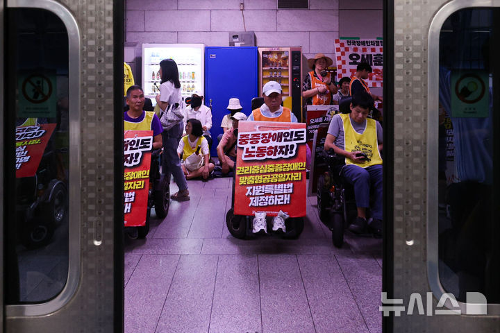 [서울=뉴시스] 권창회 기자 = 전국장애인차별철폐연대 회원들이 15일 서울 시청역 승강장에서 열린 '오세훈 서울시장님 지하철탑니다, 대화합시다' 지하철행동에서 구호를 외치고 있다. 2025.07.15. [email protected]