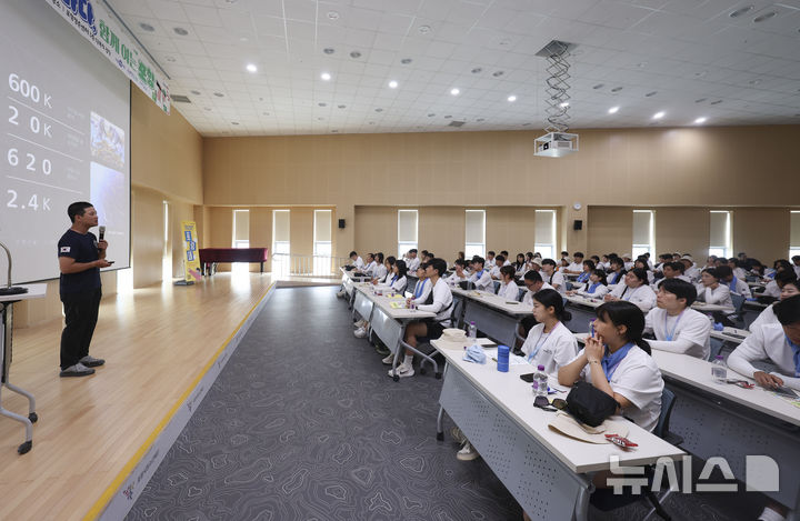 [포항=뉴시스] 김근수 기자 = 석다현 비영리민간단체 오션캠퍼스 이사장이 15일 경북 포항청춘센터에서 해양환경을 주제로 2025 대한민국 해양문화대장정에 참가한 대학생들을 상대로 강연을 하고 있다.