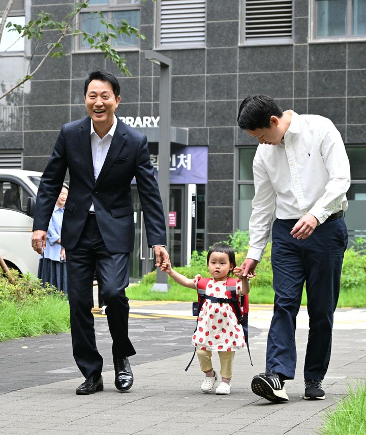 [서울=뉴시스] 오세훈 서울시장이 15일 서울 광진구 자양동 롯데캐슬 이스트폴 '미리내집'에 입주한 신혼부부 가정을 찾아 입주자 자녀의 등원을 돕고 있다. (사진=서울시 제공) 2025.07.15. [email protected] *재판매 및 DB 금지