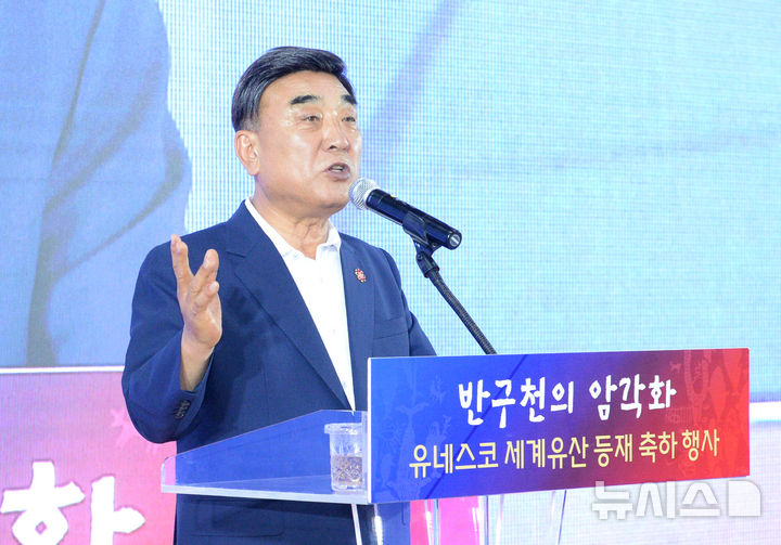 [울산=뉴시스] 배병수 기자 = 김두겸 울산시장이 15일 오후 시청 로비에서 열린 반구천의 암각화 유네스코 세계유산 등재 축하행사에서 인사말을 하고 있다. [email protected].