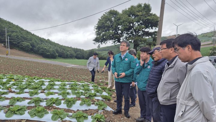 [서울=뉴시스] 서효원 농촌진흥청 차장이 15일 강원도 태백에 있는 여름배추 재배지에서 생육 상황 점검 및 작황을 살피고 있다. (사진=농촌진흥청 제공) 2025.07.15. [email protected] *재판매 및 DB 금지