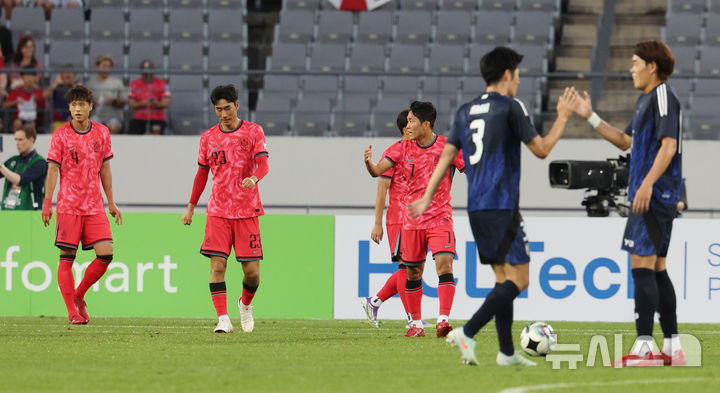 [용인=뉴시스] 김진아 기자 = 15일 경기 용인미르스타디움에서 열린 2025 동아시아축구연맹(EAFF) E-1 챔피언십(동아시안컵) 남자부 한국과 일본의 경기, 한국 선수들이 일본 료 저메인에게 실점을 허용한 뒤 아쉬워하고 있다. 2025.07.15. [email protected]