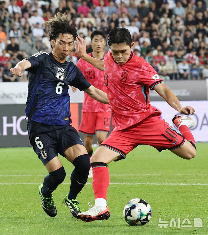 [용인=뉴시스] 김진아 기자 = 15일 경기 용인미르스타디움에서 열린 2025 동아시아축구연맹(EAFF) E-1 챔피언십(동아시안컵) 남자부 한국과 일본의 경기, 한국 이동경이 슛을 시도하고 있다. 2025.07.15. [email protected]
