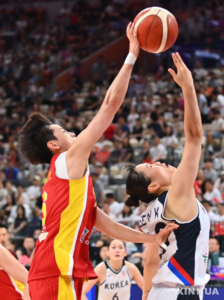 [선전=신화/뉴시스] 한국 여자농구 대표팀의 이명관(오른쪽)이 15일(현지 시간) 중국 광둥성 선전 스포츠센터에서 열린 2025 국제농구연맹(FIBA) 여자 아시아컵 조별리그 A조 2차전 중국과 경기 중 공을 다투고 있다. 한국이 69-91로 패해 1승 1패를 기록했다. 2025.07.16.