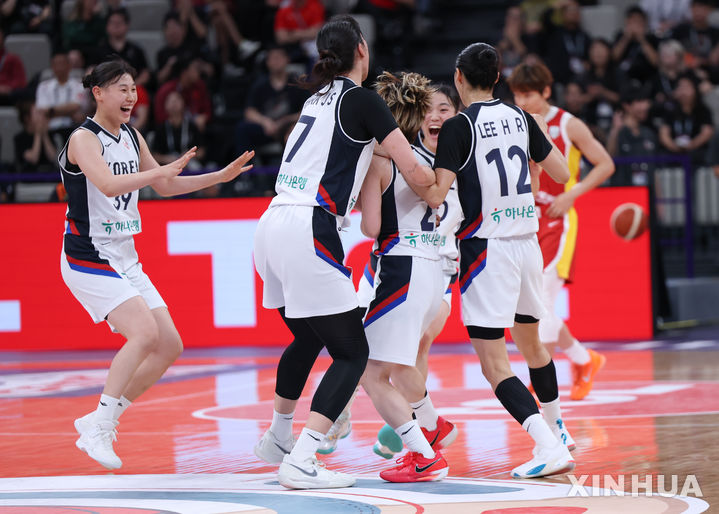 [선전=신화/뉴시스] 한국 여자농구 대표팀 선수들이 15일(현지 시간) 중국 광둥성 선전 스포츠센터에서 열린 2025 국제농구연맹(FIBA) 여자 아시아컵 조별리그 A조 2차전 중국과 경기 중 득점에 환호하고 있다. 한국이 69-91로 패해 1승 1패를 기록했다. 2025.07.16.