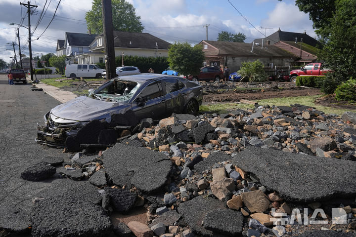 뉴저지주 돌발 홍수로 파손된 도로와 자동차