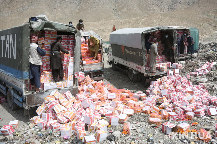 [베이징=신화/뉴시스] 15일(현지 시간) 아프가니스탄 카불에서 근로자들이 유통기한이 지났거나 질이 나쁜 식품들을 버리고 있다. 아프간 보건부 관계자는 불량식품과 유통기한이 지난 식품 65톤을 수거해 폐기했다고 밝혔다. 2025.07.16.