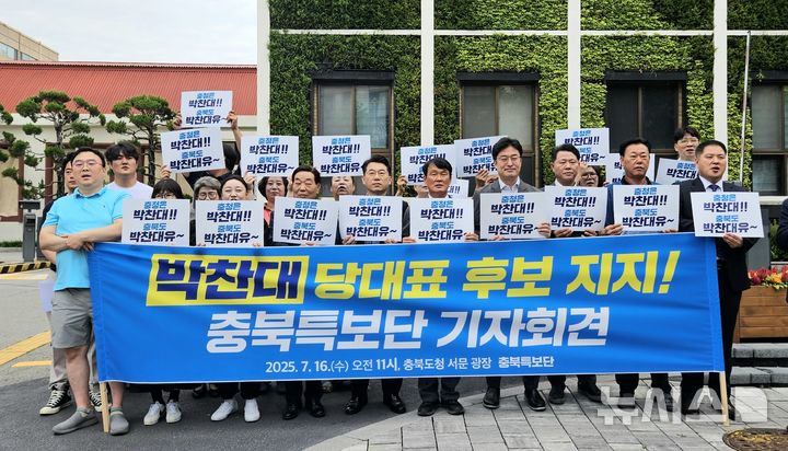 [청주=뉴시스] 이도근 기자= 더불어민주당 충북지역 전·현직 지방의원과 당원, 도민 등 2000여명으로 구성된 충북특보단이 16일 청주시 상당구 문화동 충북도청 앞에서 박찬대 당대표 후보에 대한 지지를 선언하고 있다. 2025.07.16. [email protected]
