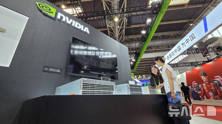 [베이징=뉴시스] 박정규 특파원 = 16일 중국 베이징 중국국제전람센터에서 열린 제3회 중국국제공급망촉진박람회에 마련된 엔비디아 부스에서 관람객들이 전시제품을 둘러보고 있다. 엔비디아는 공급망박람회에 이번에 처음 참가했다. 2025.07.16 [email protected]