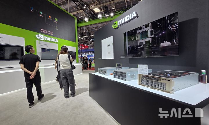 [베이징=뉴시스] 박정규 특파원 = 16일 중국 베이징 중국국제전람센터에서 열린 제3회 중국국제공급망촉진박람회에 마련된 엔비디아 부스에서 관람객들이 전시제품을 둘러보고 있다. 엔비디아는 공급망박람회에 이번에 처음 참가했다. 2025.07.16 [email protected]