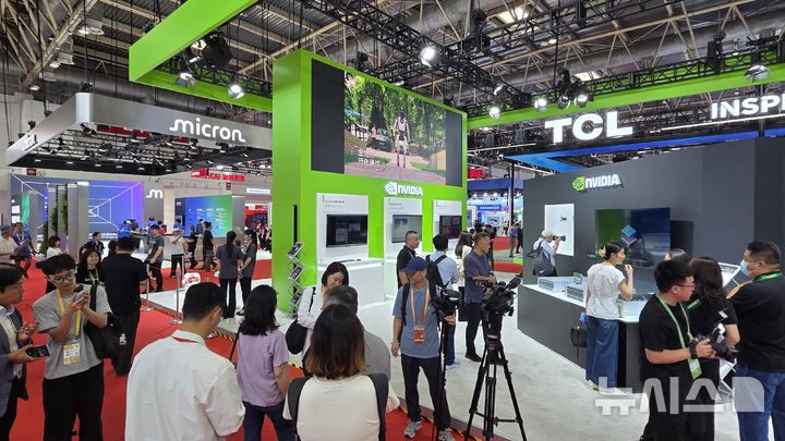 [베이징=뉴시스] 박정규 특파원 = 16일 중국 베이징 중국국제전람센터에서 열린 제3회 중국국제공급망촉진박람회에 마련된 엔비디아 전시장을 관람객들이 둘러보고 있다. 엔비디아는 공급망박람회에 이번에 처음 참가했다. 2025.07.16 [email protected]
