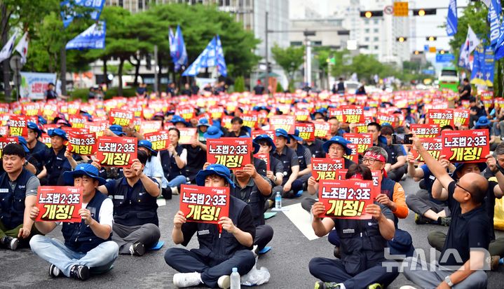 [광주=뉴시스]이현행 기자= 전국금속노동조합 광주전남지부가 16일 오후 광주 서구 시청 앞에서 금속노동자 총파업 대회를 열고 구호를 외치고 있다. 2025.07.16. [email protected]
