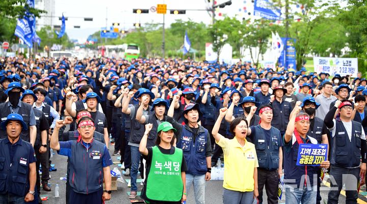 [광주=뉴시스]이현행 기자= 전국금속노동조합 광주전남지부가 16일 오후 광주 서구 시청 앞에서 금속노동자 총파업 대회를 열고 결의를 다지고 있다. 2025.07.16. [email protected]