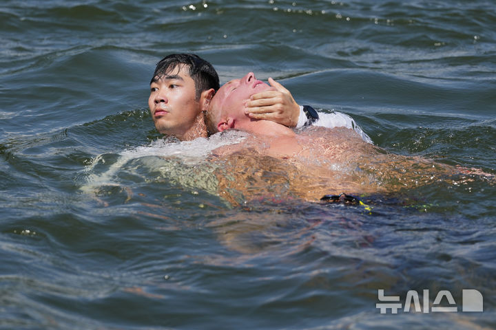 [싱가포르=AP/뉴시스] 16일(현지 시간) 싱가포르 센토사섬에서 열린 2025 세계수영선수권대회 오픈워터 남자 10㎞ 경기 도중 프랑스의 마르크-앙투안 올리비에가 구조 요원의 도움을 받아 해변으로 옮겨지고 있다. 2025.07.16.