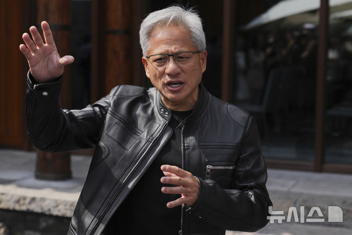 [베이징=AP/뉴시스] 젠슨 황 엔비디아 최고경영자(CEO)가 16일(현지 시간) 중국 베이징에서 열린 제3회 중국 국제 공급망 촉진 박람회(CISCE) 참석 후 만다린 오리엔탈 첸먼 호텔에서 기자회견하고 있다. 2025.07.16.
