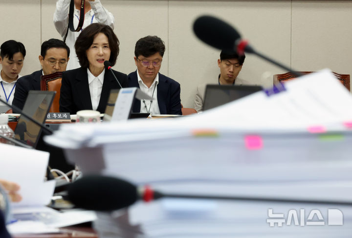 [서울=뉴시스] 고승민 기자 = 이진숙 사회부총리 겸 교육부 장관 후보자가 16일 서울 여의도 국회 교육위원회에서 열린 인사청문회에서 의원 질의에 답하고 있다. 문서는 김대식 국민의힘 의원이 가져온 이 후보자의 논문들. 2025.07.16. [email protected]