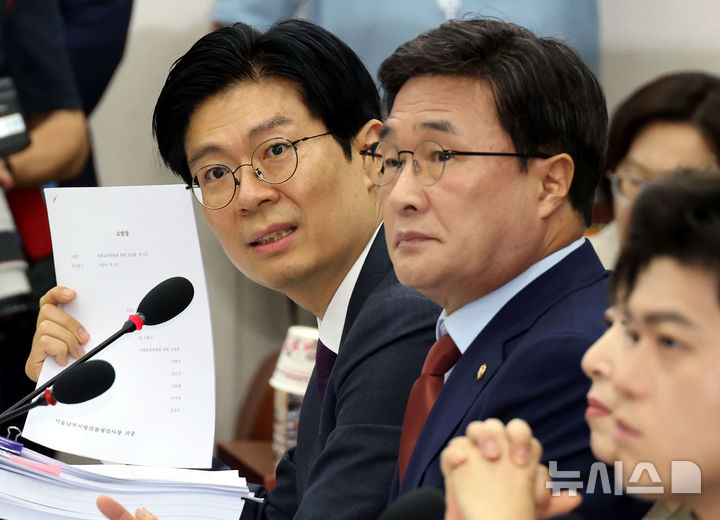 [서울=뉴시스] 조성봉 기자 = 조정훈 국민의힘 의원이 16일 서울 여의도 국회 교육위원회에서 열린 이진숙 사회부총리 겸 교육부 장관 인사청문회에서 이 후보에 대한 국민의힘 교육위 의원들의 고발장을 들어보이고 있다. 2025.07.16. [email protected]