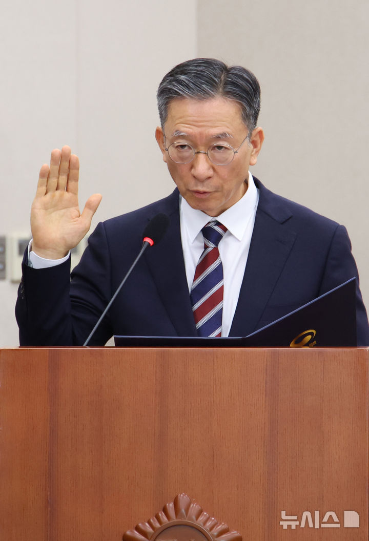 [서울=뉴시스] 김금보 기자 = 정성호 법무부 장관 후보자가 16일 서울 여의도 국회 법제사법위원회에서 열린 인사청문회에서 선서를 하고 있다. 2025.07.16. [email protected]