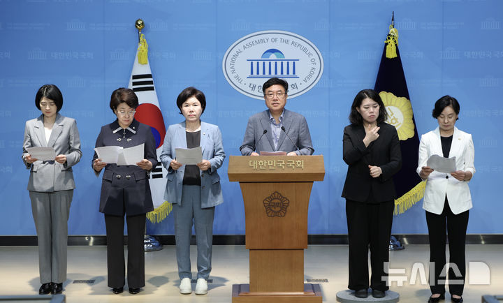 [서울=뉴시스] 김명년 기자 = 서범수 국민의힘 의원이 16일 오전 서울 여의도 국회 소통관에서 열린 '강선우 여성가족부 장관 후보자 인사청문회 자료 늑장 제출' 관련 기자회견에서 발언을 하고 있다. 왼쪽부터 한지아, 이달희, 조은희 의원, 서 의원, 수어통역사, 서명옥 의원.  2025.07.16. [email protected]