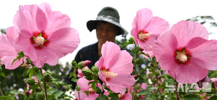 [수원=뉴시스] 김종택 기자 = 제헌절을 하루 앞둔 16일 경기 수원시 권선구 수원무궁화원에서 관계자들이 무궁화를 관리하고 있다.