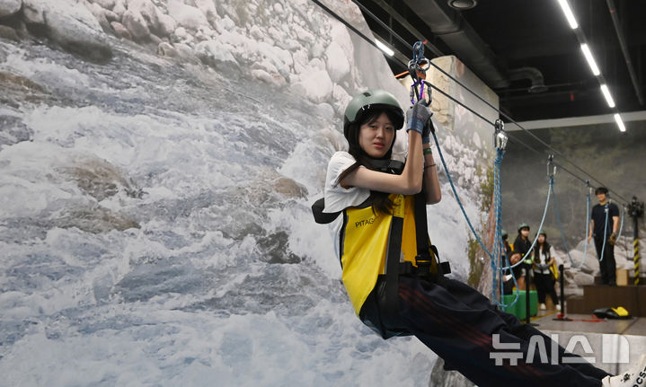 [오산=뉴시스] 김종택 기자 = 본격적인 휴가철을 앞두고 16일 경기 오산시 경기도 국민안전체험관에서 학생들이 물놀이 등으로 인한 안전사고 예방을 위해 계곡고립 탈출 체험을 하고 있다. 2025.07.16. [email protected]