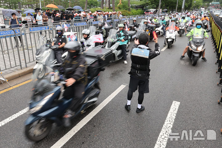 [서울=뉴시스] 권창회 기자 = 배달플랫폼노조 조합원과 배달라이더들이 16일서울 용산구 대통령실 인근에서 열린 갑질투성이 배민 쿠팡 규탄! 7.16 라이더 대행진 집회를 마치고 국회 방면으로 행진하고 있다. 2025.07.16. [email protected]