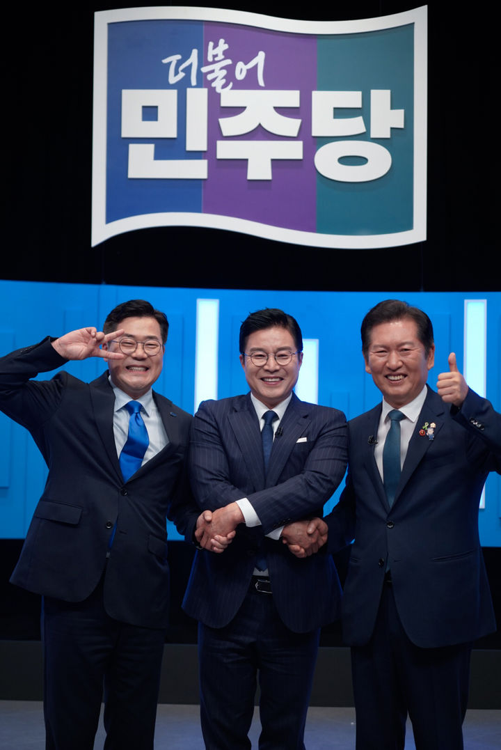 [서울=뉴시스] 김명년 기자 = 정청래·박찬대 더불어민주당 당대표 후보가 16일 서울 양천구 목동 SBS에서 열린 TV토론회를 마치고 사회자와 기념촬영을 하고 있다.(사진=박찬대 의원실 제공) 2025.07.16. [email protected] *재판매 및 DB 금지