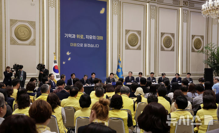 [서울=뉴시스] 최동준 기자 = 이재명 대통령이 16일 청와대 영빈관에서 열린 '기억과 위로, 치유의 대화' 사회적 참사 유가족과 간담회에서 유가족의 발언을 듣고 있다. 2025.07.16. [email protected]