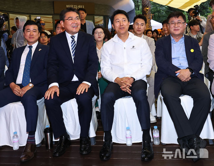 [서울=뉴시스] 최진석 기자 = 오세훈 서울시장이 16일 서울시 노원구 상계동 위치한 서울 최초의 자연휴양림인 '수락 휴(休)'에서 열린 개장식에 참석해 오승록 노원구청장과 미소짓고 있다. 왼쪽부터 손영준 서울 노원구의회 의장, 오 노원구청장, 오 서울시장, 환경부 장관 후보자 김성환 의원. 2025.07.16. [email protected]