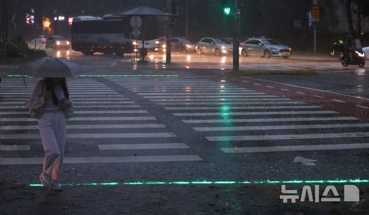 [서울=뉴시스] 최진석 기자 = 서울 전역에 호우주의보가 발효된 16일 서울 노원구 상계동 거리에서 시민이 내리는 비를 맞으며 횡단보도 건너고 있다. 2025.07.16. [email protected]