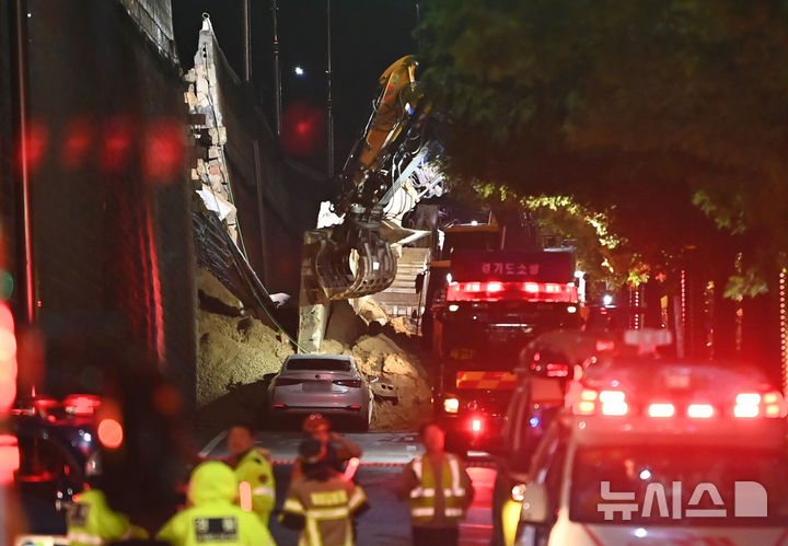 [오산=뉴시스] 김종택 기자 = 수도권 등 중부지역에 호우주의보가 발효된 16일 오후 경기 오산시 가장교차로 고가도로 옹벽이 무너져 소방관들이 매몰된 차량을 구조작업하고 있다. 2025.07.16. [email protected]