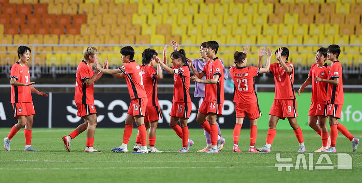 [수원=뉴시스] 김선웅 기자 = 16일 경기 수원시 수원월드컵경기장에서 열린 2025 동아시아축구연맹(EAFF) E-1 챔피언십(동아시안컵) 여자부 대한민국 vs 대만 경기, 2-0으로 승리하며 대회 우승을 확정한 선수들이 기뻐하고 있다. 2025.07.16. [email protected]