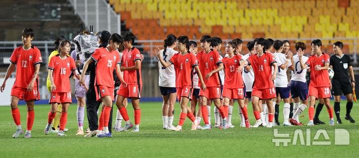 [수원=뉴시스] 김선웅 기자 = 16일 경기 수원시 수원월드컵경기장에서 열린 2025 동아시아축구연맹(EAFF) E-1 챔피언십(동아시안컵) 여자부 대한민국 vs 대만 경기, 2-0으로 승리하며 대회 우승을 확정한 선수들이 기뻐하고 있다. 2025.07.16. [email protected]