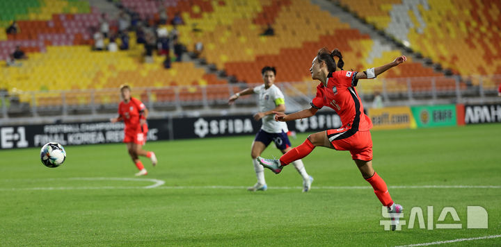 [수원=뉴시스] 김선웅 기자 = 16일 경기 수원시 수원월드컵경기장에서 열린 2025 동아시아축구연맹(EAFF) E-1 챔피언십(동아시안컵) 여자부 대한민국 vs 대만 경기, 장슬기가 슛을 하고 있다. 2025.07.16. [email protected]