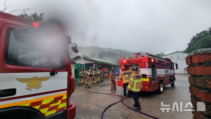 [충주=뉴시스] 17일 오전 8시15분께 충북 충주시 중앙탑면 용전리의 한 물류창고에 낙뢰로 인한 화재가 발생해 소방당국이 진화작업을 벌이고 있다. 이 불로 건물 지붕 일부가 불에 탔으나 인명피해는 없었다. (사진=충북소방본부 제공) 2025.07.17. [email protected]