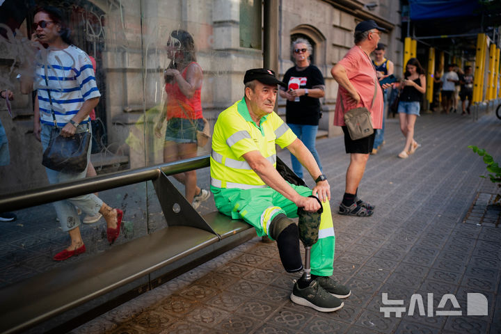 [바르셀로나=AP/뉴시스] 16일(현지 시간) 스페인 바르셀로나에서 지난달 말 폭염 속에서 근무하다 숨진 환경미화원의 죽음에 항의하는 시위에 참석한 환경미화원 라울 로드리게스(64)가 벤치에 앉아 쉬고 있다. 숨진 미화원은 몬트세 아길라르(51)로, 당시 기온이 35도를 넘는 폭염 속에서 청소 작업을 마친 뒤 귀가 후 숨졌으며, 사망 전 지인들에게 심한 고통을 호소한 것으로 알려졌다. 사건 이후 노동조합과 유가족은 열사병 등 고온과 과도한 근무 조건을 원인으로 지목했고, 시 당국은 조사에 착수했다. 2025.07.17.