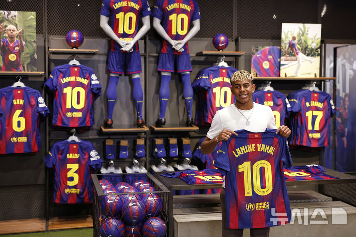[바르셀로나=AP/뉴시스] FC 바르셀로나의 라민 야말이 16일(현지 시간) 스페인 바르셀로나에서 구단과 재계약을 체결한 후 본인의 이름이 적힌, 등 번호 10번의 새 유니폼을 들고 포즈를 취하고 있다. 야말은 2031년까지 재계약을 체결하고 구단의 상징적 등 번호인 '10번'의 새 주인이 됐다. 2025.07.17.