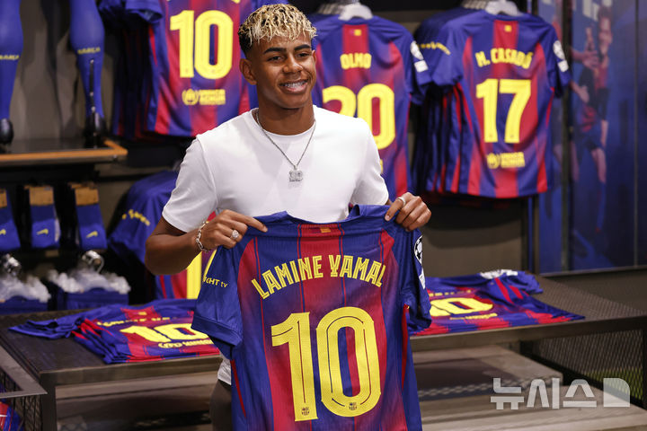 [바르셀로나=AP/뉴시스] FC 바르셀로나의 라민 야말이 16일(현지 시간) 스페인 바르셀로나에서 구단과 재계약을 체결한 후 본인의 이름이 적힌, 등 번호 10번의 새 유니폼을 들고 포즈를 취하고 있다. 야말은 2031년까지 재계약을 체결하고 구단의 상징적 등 번호인 '10번'의 새 주인이 됐다. 2025.07.17.