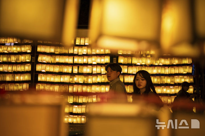 [도쿄=AP/뉴시스] 16일 일본 도쿄 야스쿠니 신사에서 미타마 마쓰리가 열려 방문객들이 노란색 등불 사이를 지나고 있다. 1947년 전몰자 추모를 위해 시작된 미타마 마쓰리는 야스쿠니 신사에서 해마다 열리는 여름 축제로 3만 개 이상의 등불이 경내를 장식해 조상을 기리고 소원을 비는 방문객들을 맞는다. 2025.07.17.