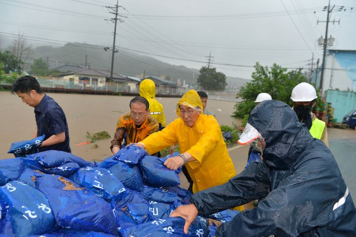 [홍성=뉴시스] 유효상 기자 = 이용록 홍성군수가 17일 갈산교 범람으로 침수 피해를 입은 갈산전통시장 일원에서 주민·공무원들과 함께 긴급 복구 작업을 벌이고 있다. (사진=홍성군 제공) 2025.07.17 [email protected]